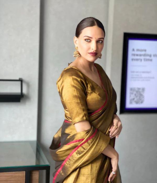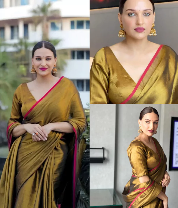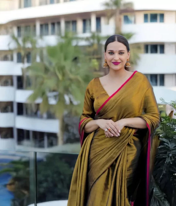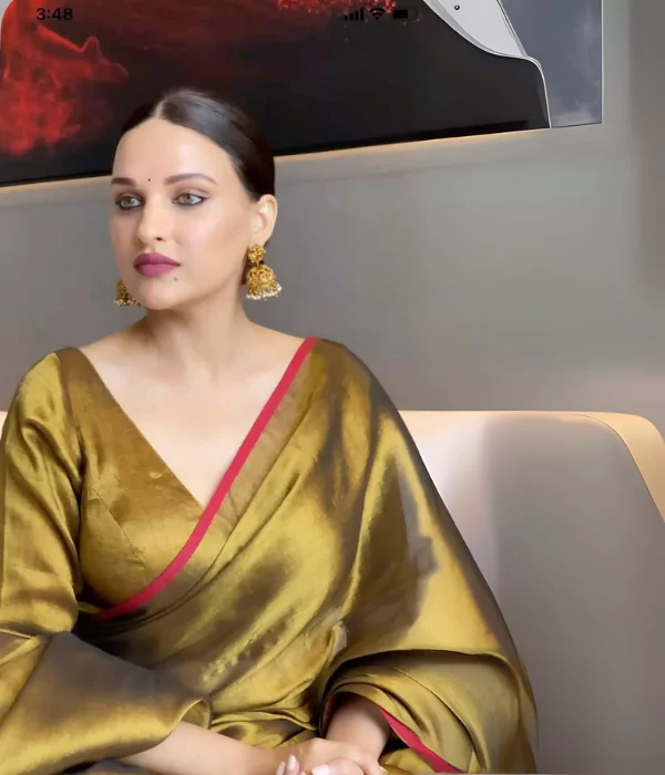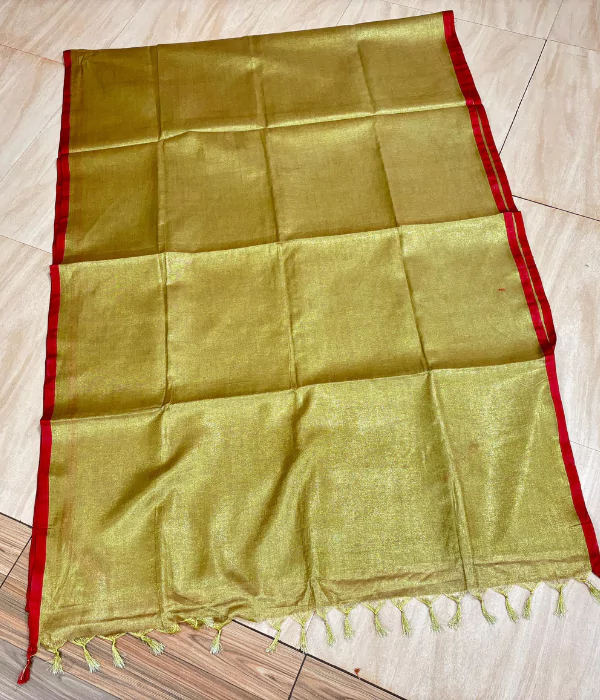 Premium golden tissue saree with bold red border. Lightweight, festive-ready design with elegant sheen. Perfect for weddings, parties, and traditional events.